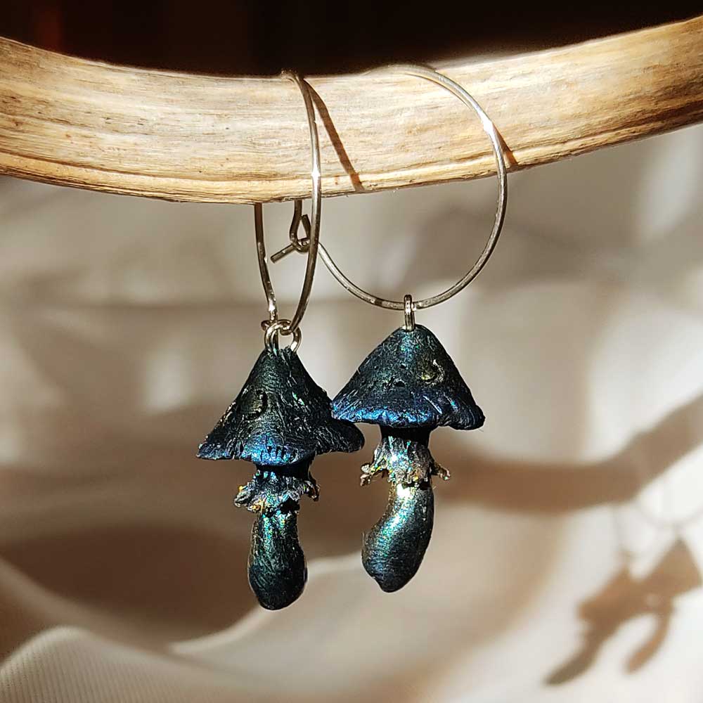 These mushroom earrings are a perfect complement to a dark witchy outfit, to join you on your outdoor frolicking or simply to express your love of nature and the cosmos.