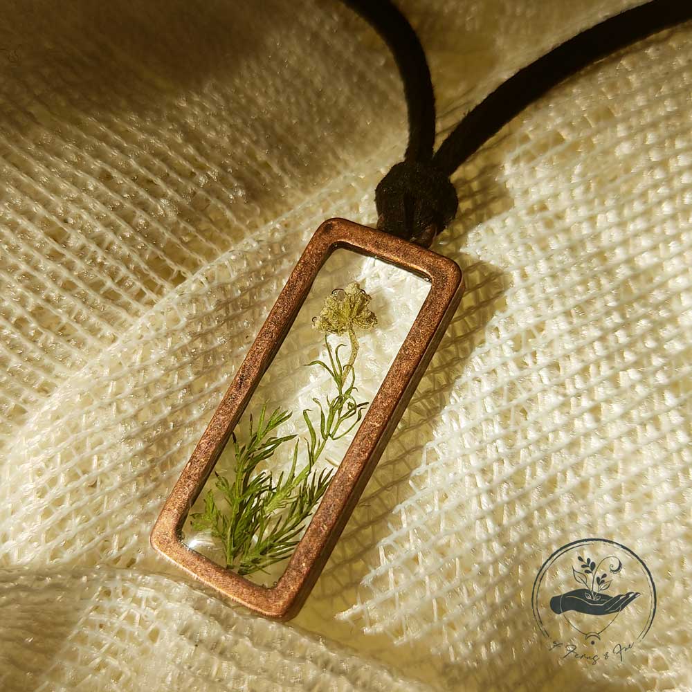 Wear a magical mini meadow flower suspended in a necklace, made with tiny genuine dried botanicals eternalised in resin.